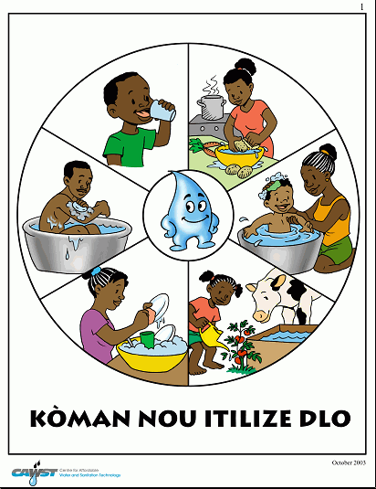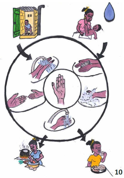 Promotion will be of good hand-washing procedures which requires the use of soap (or a local substitute), plenty of water, and careful cleaning of all parts of the hands. If water is scarce, it can be used more than once to wash hands. It can then be used to wash the floor, to clean the latrine, or to irrigate the vegetable garden.