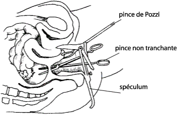 Si la culdocent�se donne issue � du pus, laisser l’aiguille en place et faire une incision � l’aide d’un instrument coupant � l’endroit o� la ponction a �t� faite :