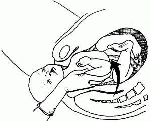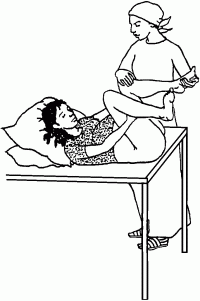 Aide poussant fermement les genoux fl�chis de la patiente vers sa poitrine
